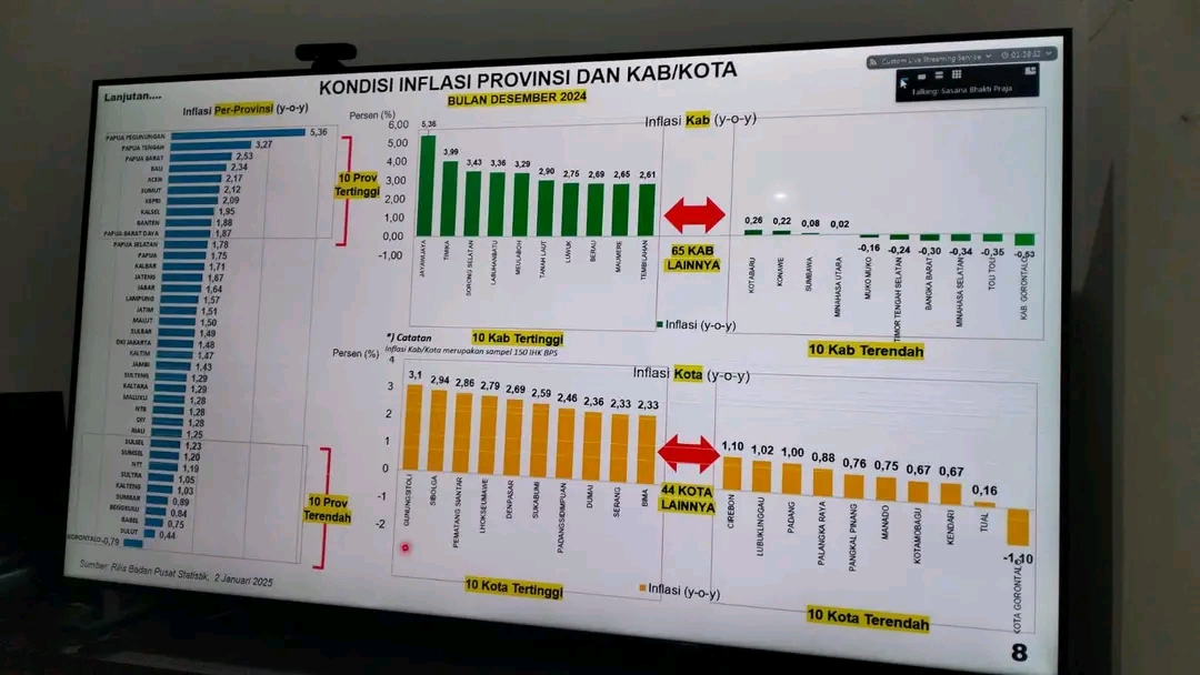 Dalam arahannya, Mendagri Tito Karnavian memaparkan perkembangan inflasi nasional dari akhir 2024 hingga awal 2025. Pada Desember 2024, inflasi bulanan tercatat meningkat dari 0,3 persen di November menjadi 0,44 persen. Sektor makanan, minuman, dan tembakau menjadi penyumbang terbesar inflasi dengan kontribusi 1,33 persen, disusul sektor kesehatan (0,35 persen) dan perawatan pribadi serta jasa lainnya (0,26 persen).