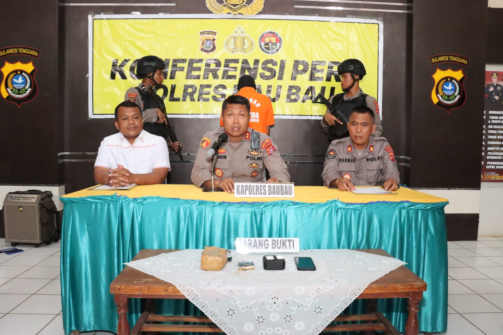 “Pada saat tersangka ingin mengambil paket kiriman tersebut langsung ditangkap dan benar ditemukan sebuah paket coklat yang di dalamnya terdapat kotak speaker kecil yang diselipkan pembungkus rokok Gudang Garam Surya,” ucap Kapolres Baubau AKBP Bungin Masokan Misalayuk saat Konferensi pers.