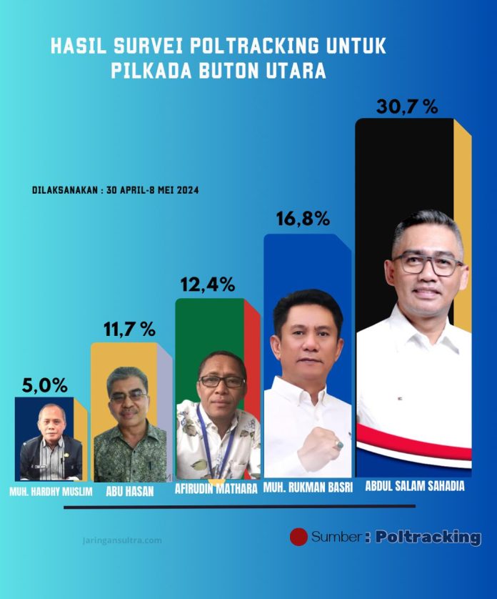 Buranga, Jaringansultra.com – Lembaga survei kredibel Poltracking Indonesia merilis hasil survei Pemilihan Bupati (Pilbup) Buton Utara (Butur) 2024. Hasilnya, Anggota DPRD Provinsi Sulawesi Tenggara (Sultra), Abdul Salam Sahadia (ASS) meraih elektabilitas tertinggi.