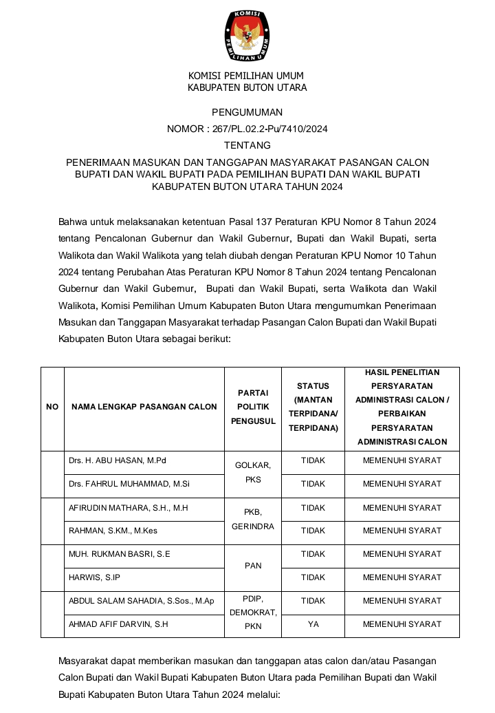 Buranga, Jaringansultra.com- Komisi Pemilihan Umum (KPU) Kabupaten Buton Utara (Butur) membuka ruang bagi masyatakat untuk memberikan masukan dan tanggapan pasangan calon bupati dan waki bupati Buton Utara Pilkada tahun 2024.