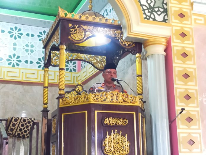 Buton, Jaringansultra.com – Wakapolres Buton, Kompol Tiswan melaksanakan salat Jumat berjamaah di Masjid Al-Nur Kelurahan Takimpo, Kecamatan Pasarwajo, Kabupaten Buton, Sulawesi Tenggara (Sultra) Jum’at 7 Juli 2023.