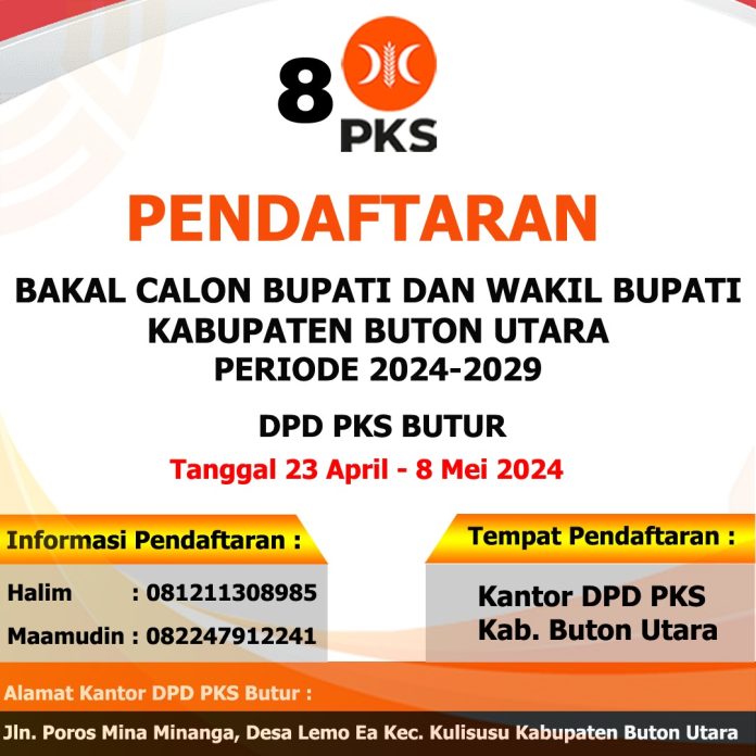 Buranga, Jaringansultra.com – Dewan Pimpinan Daerah (DPD) Partai Keadilan Sejahtera (PKS) Kabupaten Buton Utara (Butur), membuka pendaftaran Calon Bupati dan Wakil Bupati Butur untuk pilkada serentak tahun 2024.