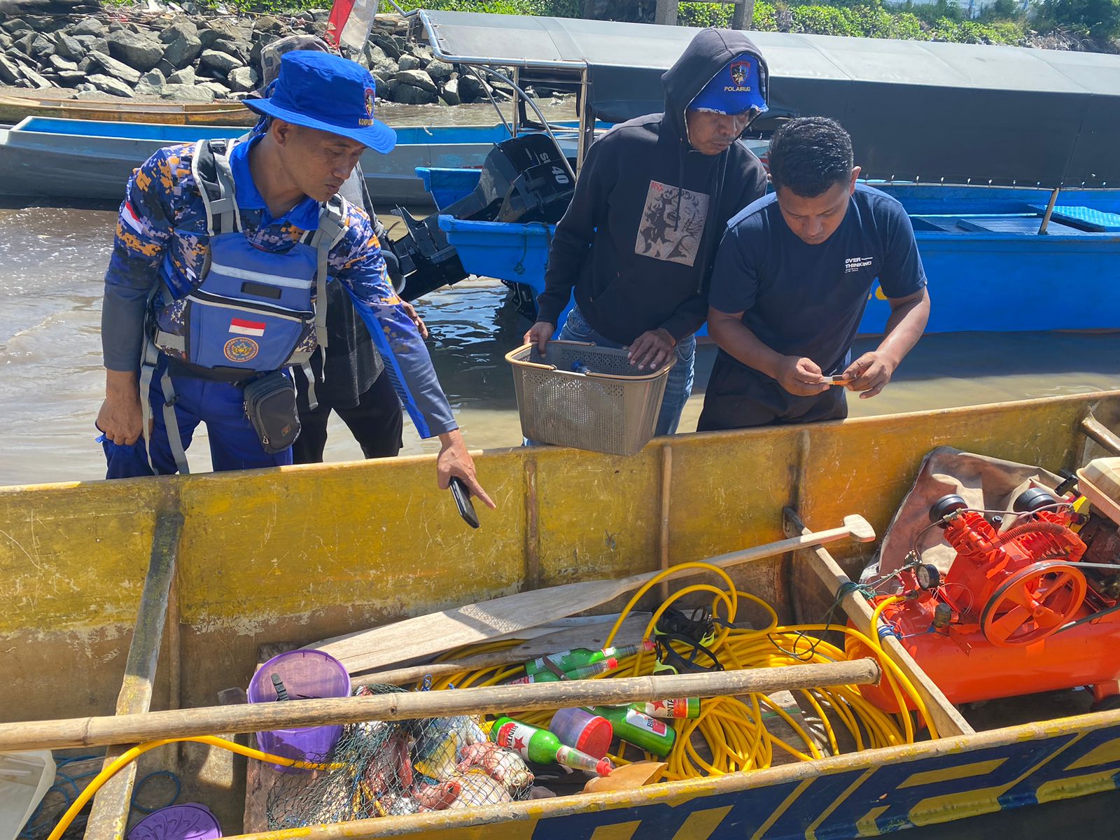 Dalam pengamanan tersebut, barang bukti yang berhasil diamankan antara lain 5 botol bahan peledak (dikemas dalam botol kaca merk Bir Bintang), 1 unit perahu bermesin tanpa nama berwarna kuning, 1 set kompresor, 4 buah kacamata selam, 6 biji pemberat dari bahan timah, 8 buah sumbu ledak/dopis cadangan, 1 gulung obat nyamuk, 1 buah korek api gas, dan 4 kg ikan karang campuran.