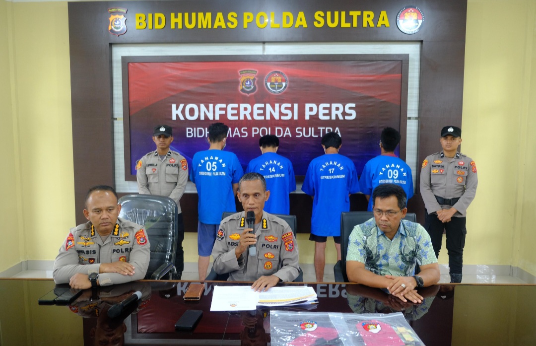 Dalam konferensi pers yang digelar di Balai Wartawan pada Jumat, 16 Mei 2025, Kabid Humas Polda Sultra Kombes Pol Iis Kristian bersama Karo Ops Polda Sultra Kombes Pol Wasis Santoso.
