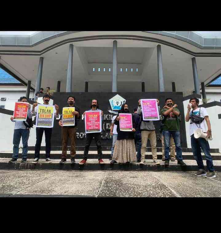 Belasan jurnalis ini menggelar aksi di DPRD Sulawesi Tenggara (Sultra) dengan aksi tutup mulut menggunakan lakban dan membawa poster “Tolak Pasal-Pasal Bermasalah RKUHP yang Memasukan Sengketa Pers dalam Pidana Umum”.