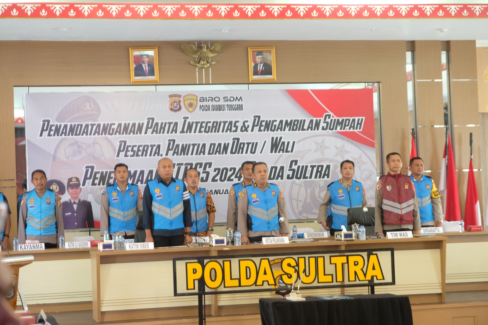 Kendari, Jaringansultra.com – Kabag Dalpers Biro SDM Polda Sultra AKBP Saminata yang mewakili Karo SDM Kombes Pol Danang Beny K. memimpin pembacaan Sumpah dan Penandatanganan Pakta Integritas dalam penerimaan Sekolah Inspektur Polisi Sumber Sarjana (SIPSS) panitia daerah Polda Sultra 2024.