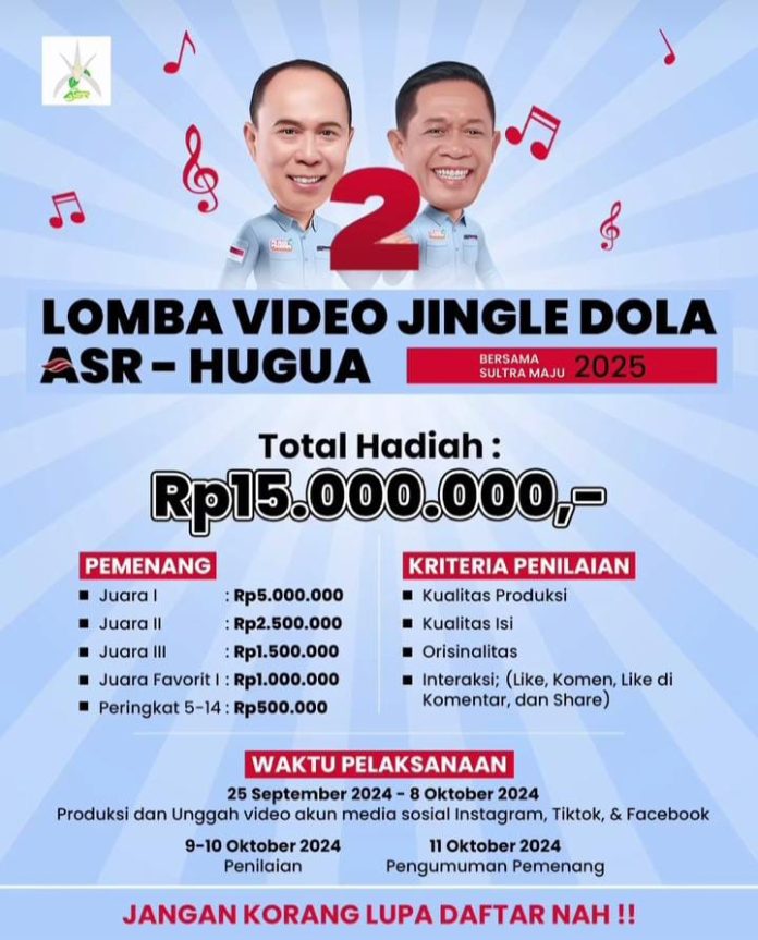 Kendari, Jaringansultra.com – Pasangan calon (Paslon) Gubernur dan Wakil Gubernur Sultra Andi Sumangerukka (ASR) dan Hugua bakal mengadakan lomba video jingle dola, Jumat 27 September 2024.
