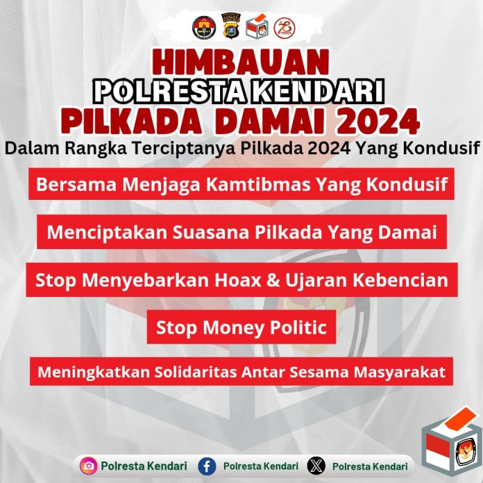 Kendari, Jaringansultra.com – Demi menjaga kondusifitas menjelang pelaksanaan Pilkada serentak 2024, Kapolresta Kendari Kombes Pol. Aris Tri Yunarko mengeluarkan himbauan penting kepada seluruh masyarakat wilayah hukum Polresta Kendari, Himbauan tersebut bertujuan untuk menciptakan suasana pemilu yang aman, damai dan kondusif.