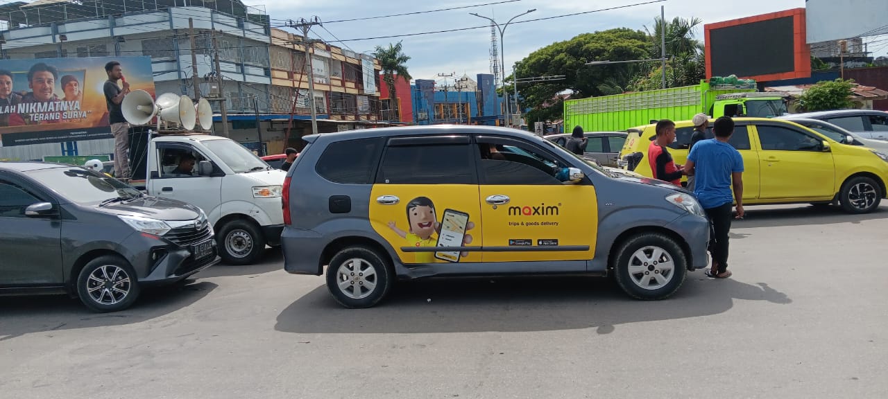 Dalam aksi demonstrasi itu puluhan driver Maxim dan ojol memarkirkan mobilnya di tengah perempatan Pasar Baru sehingga mengakibat kemacetan.