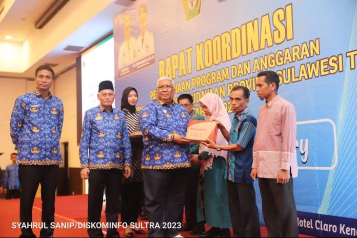 Gubernur Sultra Ali Mazi saat menyerahkan penghargaan festival literasi kepada beberapa perwakilan sekolah di Kota Kendari. (Dok: Diskominfo Sultra).