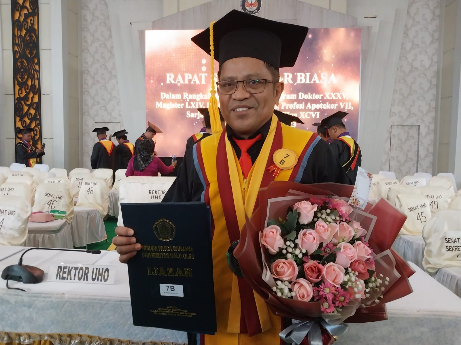 “Alhamdulillah Hari ini saya diwisuda sebagai Doktor. Untuk Doktor konsentrasi di Manajemen Sumber Daya Manusia,” ucapnya usai mengikuti prosesi wisuda bertempat di Gedung Auditorium Mokodompit UHO Kendari.