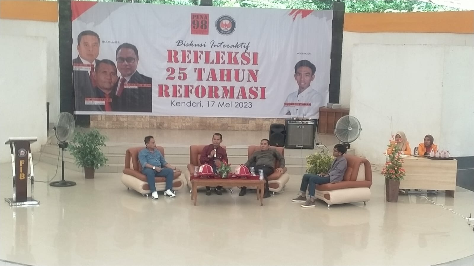 Kendari, Jaringansultra.com – Persatuan Nasional Aktivis (PENA) 98 Sulawesi Tenggara (Sultra) menggandeng Fakultas Ilmu Budaya (FIB) Universitas Halu Oleo (UHO) Kendari menggelar diskusi interaktif Refleksi 25 Tahun Reformasi di Gedung Teater FIB, Rabu 17 Mei 2023.