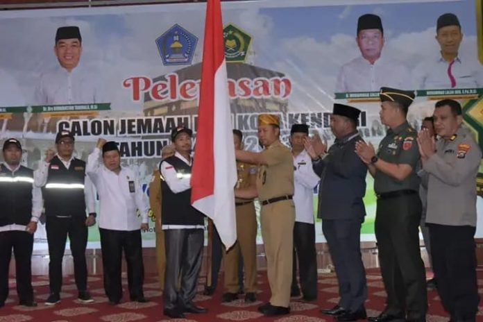 Pelepasan ini dilakukan langsung Panjabat (Pj) Wali kota Kendari Asmawa Tosepu dengan penyerahan bendera merah putih kepada Jemaah Haji disaksikan Ketua DPRD Kota Kendari, Forkopimda Kota Kendari serta Pejabat Pemerintah Kota Kendari yang sempat turut hadir.
