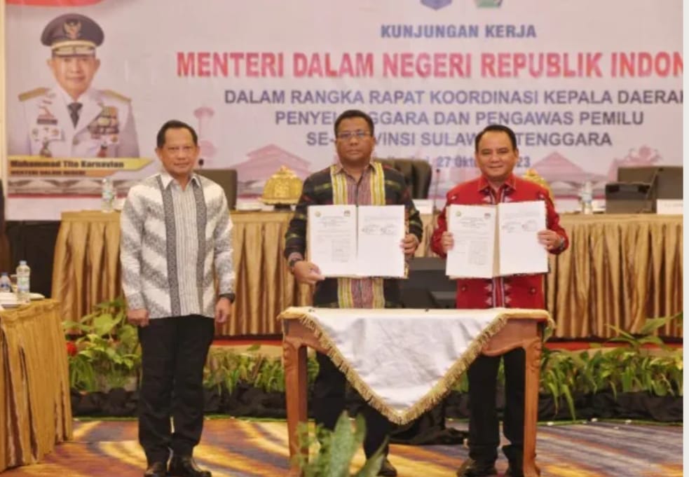 Kesepakatan ini ditandai dengan penandatanganan Naskah Perjanjian Hibah Daerah (NPHD) antara Pj. Gubernur Sultra, Andap Budhi Revianto, bersama Ketua KPU Sultra, Asril, di Hotel Claro Kendari, Jumat 27 Oktober 2023. Penandatanganan NPHD ini disaksikan langsung oleh Menteri Dalam Negeri, Tito Karnavian.