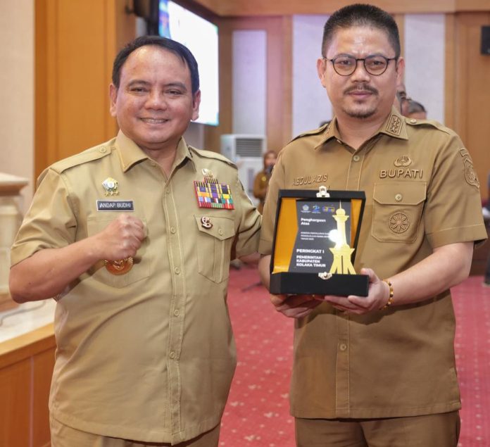 Penganugerahan ini, diserahkan Pj Gubernur Sultra Andap Budhi Revianto, kepada Bupati Koltim Abdul Azis disela-sela menyerahkan Daftar Isian Pelaksana Anggaran (DIPA) dan Daftar Alokasi Transfer Ke Daerah (TKD) tahun anggaran 2024 kepada para bupati dan wali kota dan kuasa pengguna anggaran pada satuan kerja lingkup Provinsi Sultra, di ruang pola Kantor Gubernur Sultra, pada Senin 4 Desember 2023.