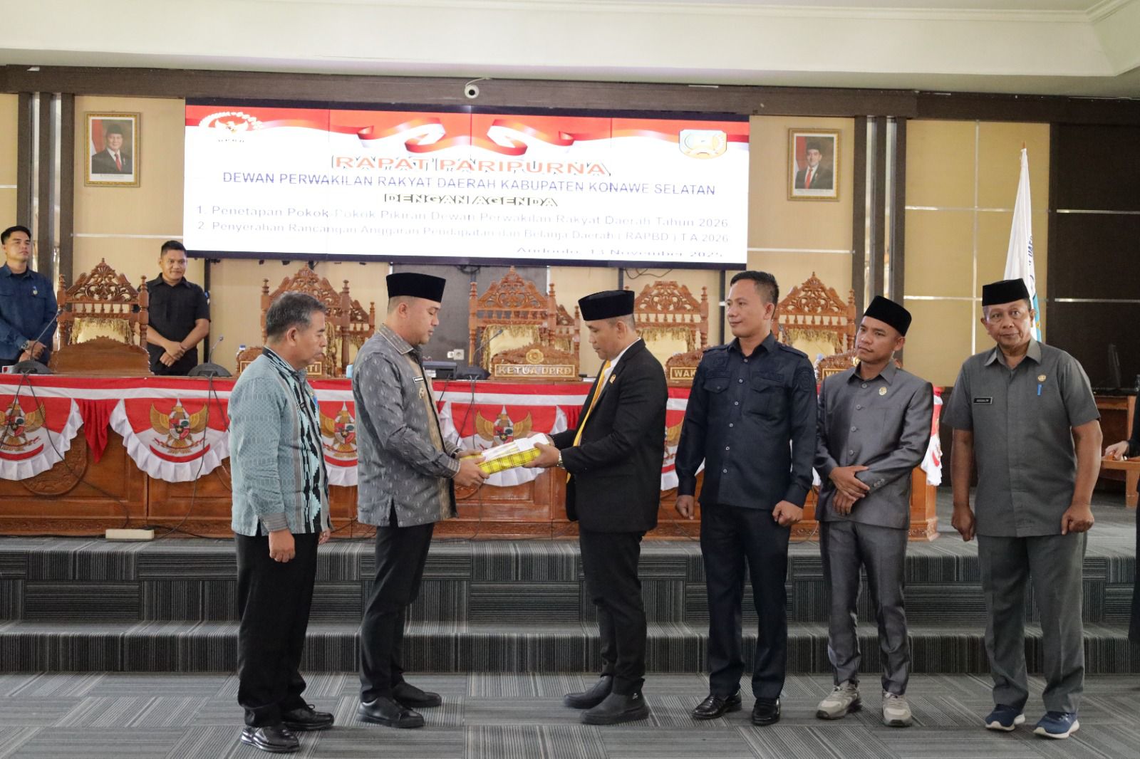 Selatan dalam hal ini diwakilkan oleh Wakil Bupati Konawe Selatan menyampaikan bahwa rapat paripurna ini bukan sekadar agenda rutin tahunan, tetapi merupakan bagian penting dalam proses penyelenggaraan pemerintahan daerah yang transparan, partisipatif, dan akuntabel, sebagai wujud komitmen kita bersama untuk mewujudkan tata kelola pemerintahan yang baik dan berorientasi pada kesejahteraan rakyat. Oleh karena itu, izinkan kami menyampaikan catatan-catatan penting terkait dengan RAPBD Konawe Selatan Tahun 2026.