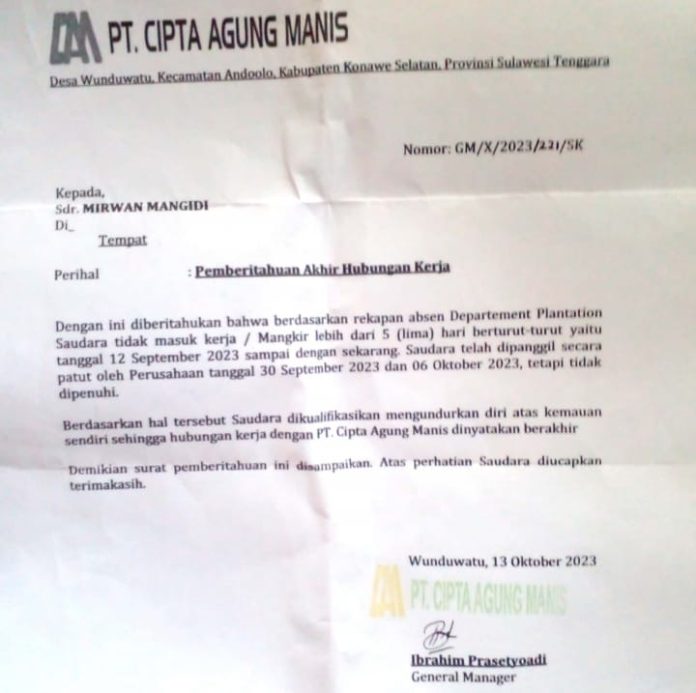 “Benar, adik saya atas nama Mirwan Mangidi di PHK tanpa adanya SP dari perusahaan tempat dia bekerja. Parahnya, surat pemberhentian hubungan kerja diserahkan di Polsek Tinanggea bersamaan dengan gaji terakhir,”ujar Eriawan Mangidi selaku kerabat Mirwan Mangidi kepada awak media, Selasa (17/10/2023).