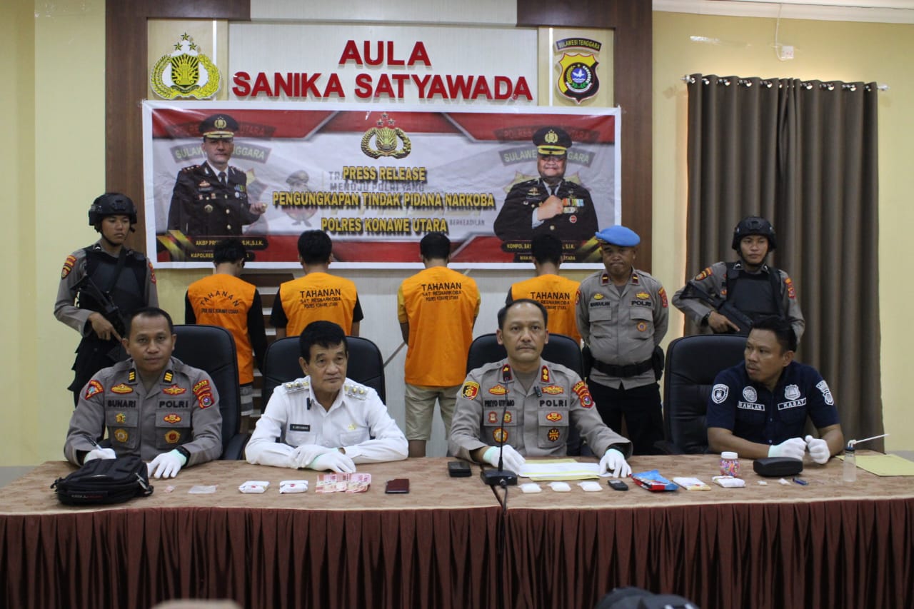 Kapolres Konawe Utara, AKBP Priyo Utomo, di dampingi Wakil Bupati Konut H. Abuhaera, Kabag Ops Polres Konawe Utara AKP Sunari, dan Kasat Narkoba Iptu Ramlang dalam konfrensi persnya, Selasa 7 Maret 2023.