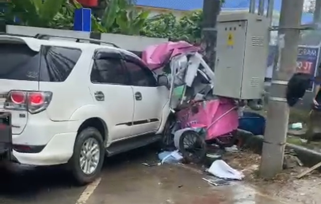 Akibatnya gerobak tersebut hancur dilindas mobil fortuner. Sementara pedagang tukang bubur mengalami luka parah.