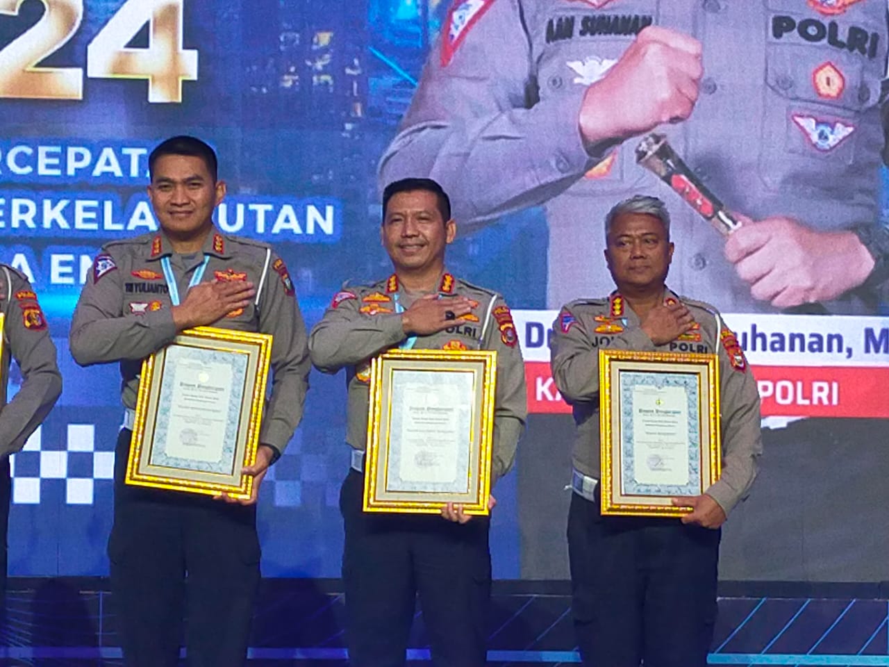 Yogyakarta, Jaringansultra.com – Direktur Lalu Lintas (Dirlantas) Polda Sulawesi Tenggara (Sultra) Kombes Pol Zainal Rio Chandra Tangkari menerima penghargaan dari Kepala Korps Lalu Lintas (Kakorlantas) Polri bidang regident (Upaya dan Pencapaian Realisasi PNBP Tahun 2023) dalam Rapat Kerja Nasional (Rakernis) Fungsi Lantas Tahun 2024.