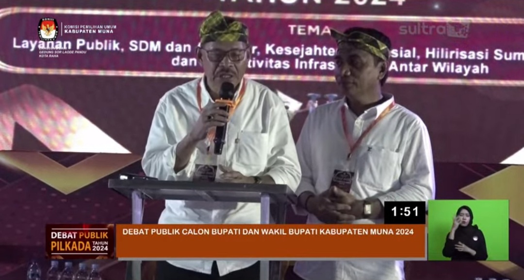 Muna, Jaringansultra.com – Komisi Pemilihan Umum (KPU) Kabupaten Muna menggelar debat publik pasangan calon (Paslon) Bupati dan Wakil Bupati Muna tahun 2024.