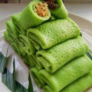 Selanjutnya, diamkan campuran kelapa parut dan gula merah. Larutkan 250 gram tepung terigu dengan 600 ml air, tambahkan pewarna makanan berwarna hijau aduk hingga rata. Cetak kulit pada teflon anti lengket (ukuran sesuai selera). Masak kulit jangan sampai kering, biarkan pada kondisi masih lembek dan elastis.