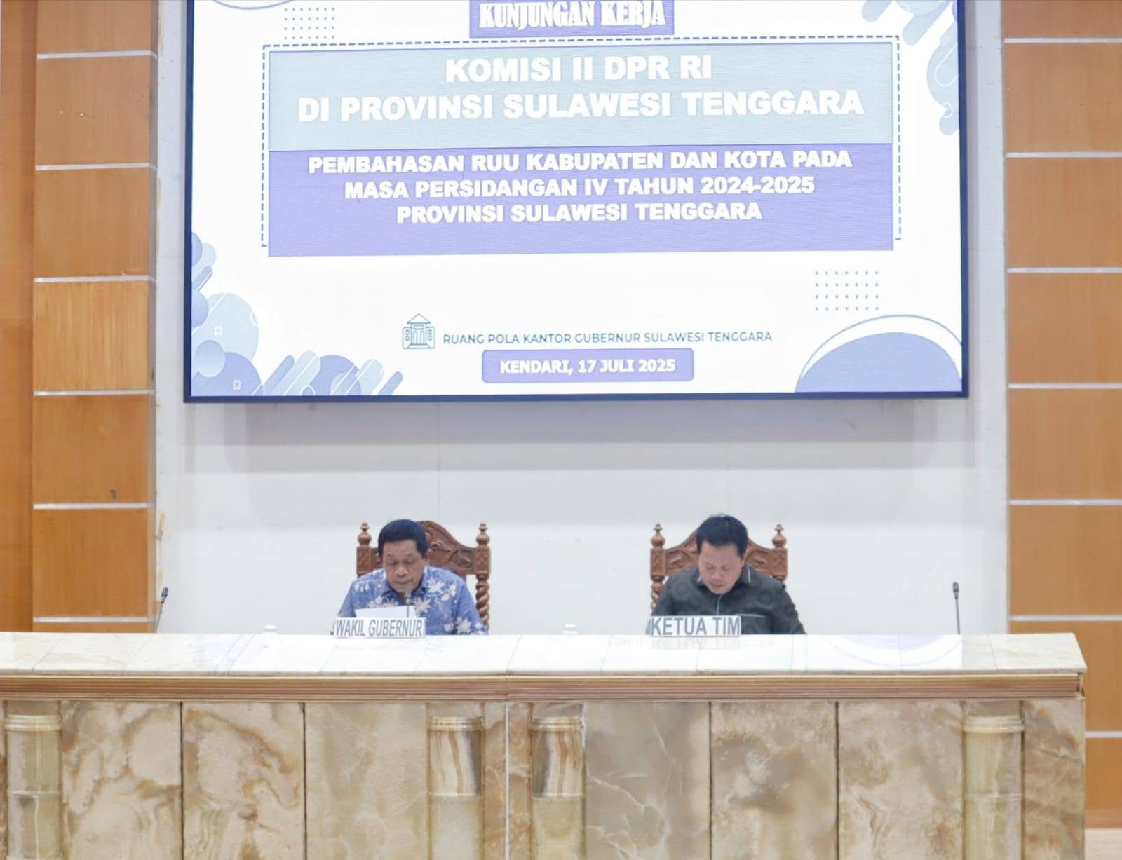 Kendari, Jaringansultra.com – Wakil Gubernur (Wagub) Sulawesi Tenggara (Sultra) Ir. Hugua, menerima kunjungan kerja Komisi II DPR RI dalam rangka pembahasan Rancangan Undang-Undang (RUU) tentang Kabupaten dan Kota pada Masa Persidangan IV Tahun Sidang 2024–2025. Pertemuan tersebut berlangsung di Ruang Pola Kantor Gubernur Sulawesi Tenggara, pada Kamis, 17 Juli 2025.
