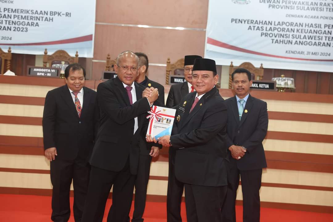 Opini WTP tersebut diberikan langsung oleh Anggota VI BPK RI Professor Pius Lustrilanang pada Rapat Paripurna DPRD dengan agenda penyerahan laporan hasil pemeriksaan BPK RI atas Laporan Keuangan Pemprov Sultra Tahun Anggaran 2023, bertempat di Ruang Rapat Paripurna DPRD, Jumat 31 Mei 2024.