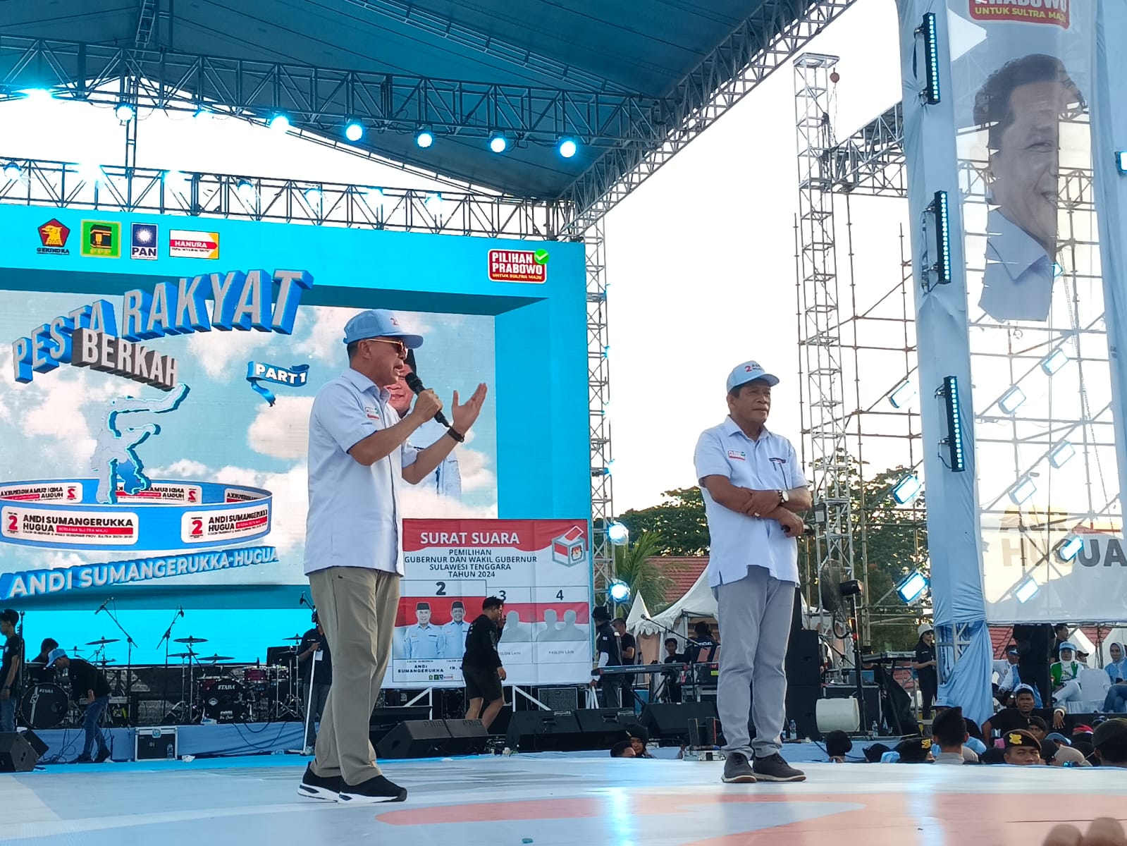 Kendari, Jaringansultra.com – Pasangan calon (paslon) gubernur dan Wakil Gubernur Sulawesi Tenggara (Sultra) nomor urut 2, Andi Sumangerukka (ASR)-Hugua menggelar kampanye akbar bertajuk ‘Pesta Rakyat Berkah Part 1’ di Lapangan Benu-Benua, Kota Kendari, Sabtu 9 November 2024.
