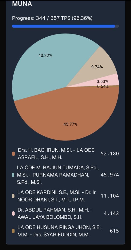 Raha, Jaringansultra.com – Perhitungan surat suara ditiap TPS pada Pemilihan Kepala Daerah (Pilkada) Kabupaten Muna telah selesai, pasangan nomor urut 01 Bachrun-Asrafil berhasil menggungguli pesaingnya.