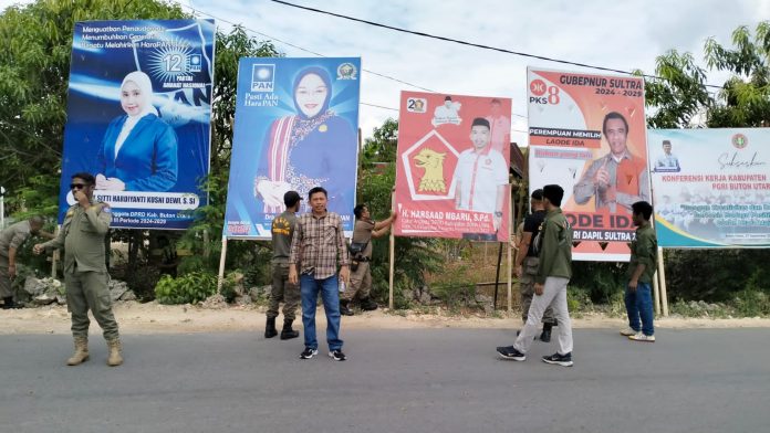 Buranga, Jaringansultra.com– Badan Pengawas Pemilu (Bawaslu) bersama Satuan Polisi Pamong Praja (Satpol PP) Buton Utara (Butur), melakukan penertiban sejumlah alat peraga kampanye (APK), di enam kecamatan, Jum’at, 3 November 2023.