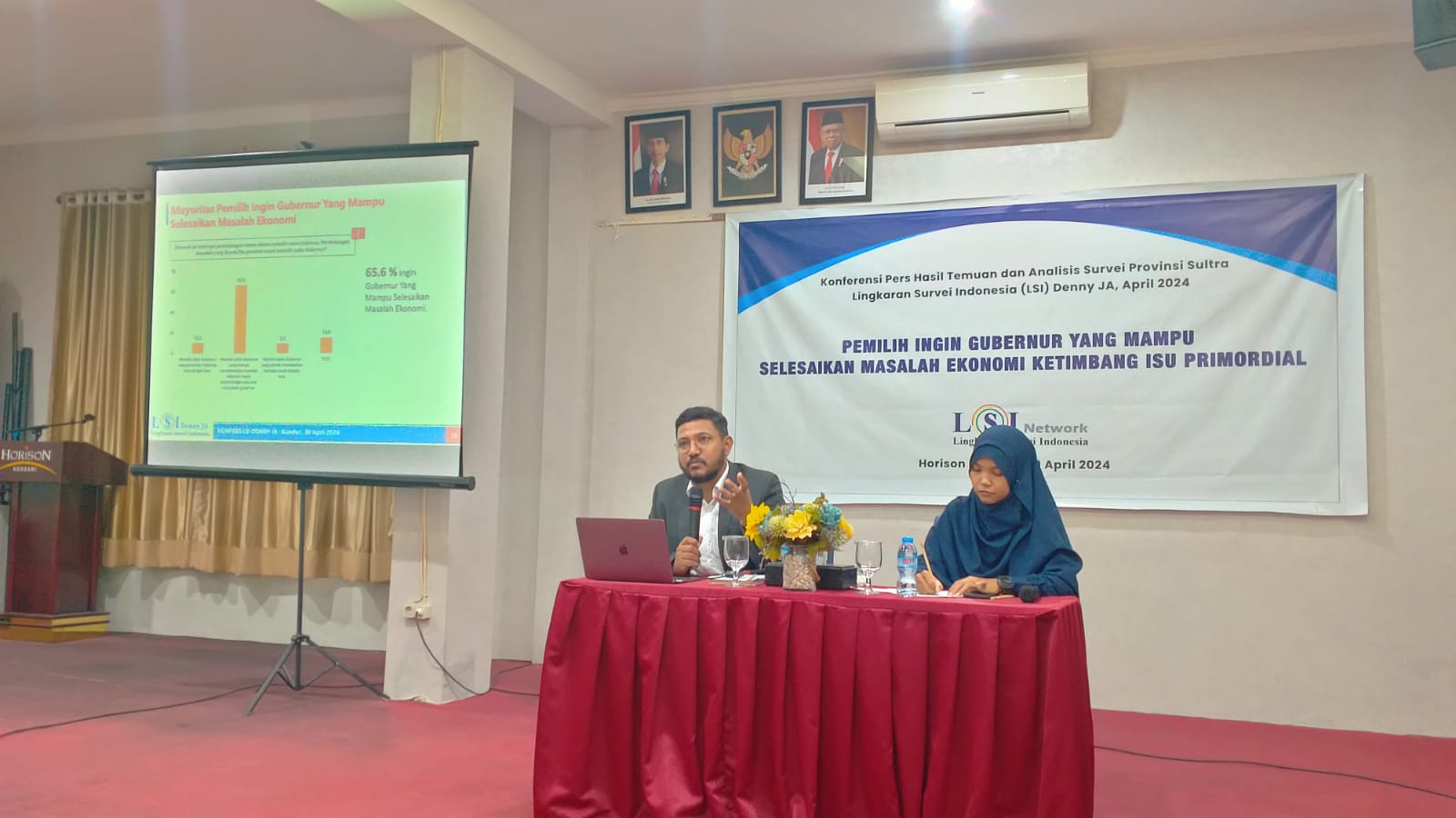 Ikrama Masloman Peneliti senior LSI Denny JA selaku penanggung jawab riset, Ikrama Masloman menjelaskan survei ini dilaksanakan pada 20 sampai 26 Maret 2024 dengan menggunakan 800 responden di seluruh kabupaten/kota di Sultra dengan metode wawancara dilaksanakan secara tatap muka (face to face interview). Margin of error (Moe) survei ini adalah sebesar +/-3.5 persen.