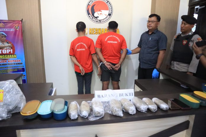 Kendari, Jaringansultra.com – Dua orang pria berinisial SAH (27) dan IF (26) dibekuk polisi saat hendak mengambil paket kiriman yang berisikan narkotika jenis ganja dengan berat brutto 1032 gram.