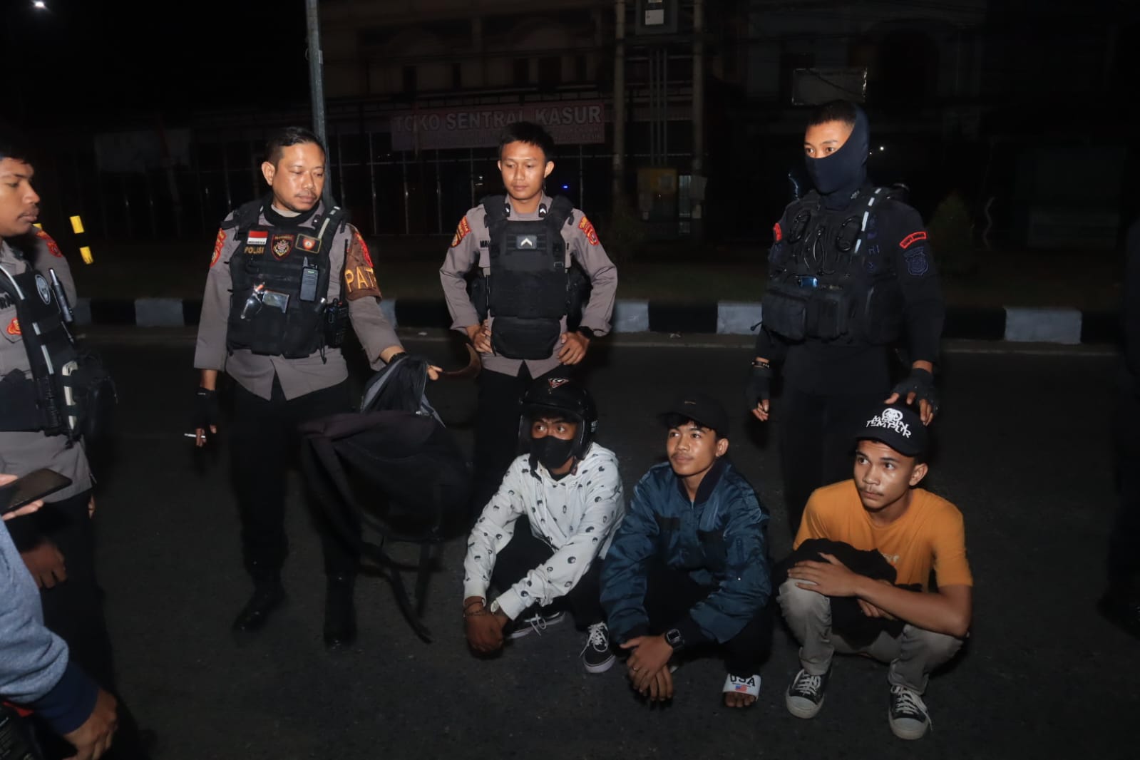 Kemudian tim patroli memberhentikan ketiga remaja tersebut, dengan tujuan akan memberikan edukasi tentang bahaya berkendaraan dengan berboncengan lebih dari dua orang, serta melakukan pemeriksaan barang bawaan.
