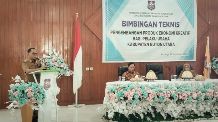 Buranga, Jaringansultra.com – Sekretaris Daerah (Sekda) Kabupaten Buton Utara (Butur) Muhammad Hardhy Muslim membuka dengan resmi Bimbingan Teknis Pengembangan Produk Ekonomi Kreatif bagi pelaku Usaha Mikro, Kecil dan Menengah (UMKM), yang bertempat di aula Bappeda Butur. Selasa, 26 September 2023.